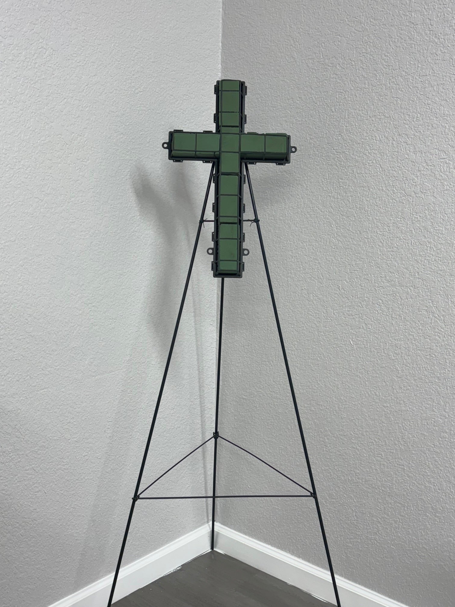 20" Cross spray filled with carnations, 1 dozen roses and mixed flowers. If wanting all roses contact store for price difference.
